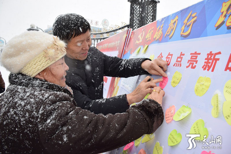 石河子公路管理局干部与亲戚共同写下“十九大报告中最感动我的一句话”并粘在展板上。