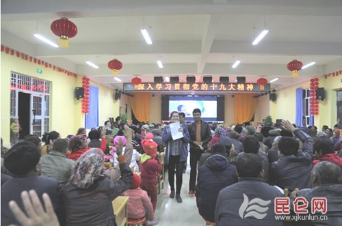 “谁知道党的十九大会议主题是什么?”电影播放到一半时,工作队队员古尔逊那依走上舞台暂停了电影,开始询问台下的村民。“我知道。不忘初心,牢记使命,高举中国特色社会主义伟大旗帜,决胜全面建成小康社会,夺取新时代中国特色社会主义伟大胜利,为实现中华民族伟大复兴的中国梦不懈奋斗。”一位年轻小伙子站起来流利地回答到。“恭喜你,回答正确,我们有一份精美礼品送给你。”小伙子的回答不但赢得了一份礼品,更是赢得了村民的阵阵掌声。村民们纷纷举手,踊跃答题,工作队准备的关于党的十九大精神的10个问题很快被抢答完毕。