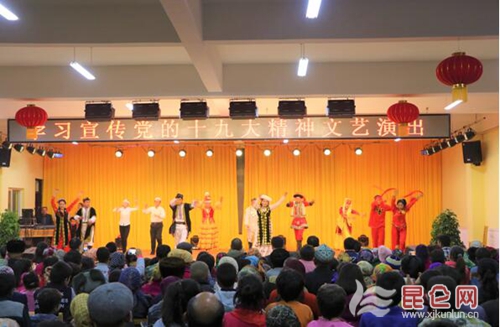 新时代,新热潮。前期在党的十九大精神“宣讲达人”评选中脱颖而出的2名“宣传达人”,在节目表演中穿插进行党的十九大精神宣讲。演出间隙,以寓教于乐的方式,穿插进行党的十九大知识有奖竞答,让群众在享受文化盛宴的同时也学习到党的十九大精神。最后,文艺演出在欢快的麦西来甫中落下帷幕。