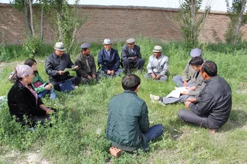 呼图壁县石梯子乡西力克特村负责政策宣讲的党员给村民讲解“三股势力”的危害