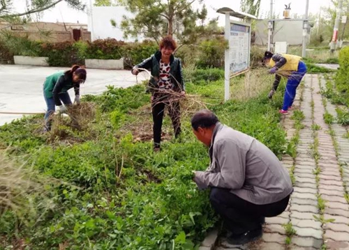 玛纳斯县北五岔镇凉州户村第一书记与村里的党员一起打扫文化室周边卫生