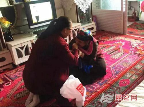 工作队员为“亲戚”送上丝巾