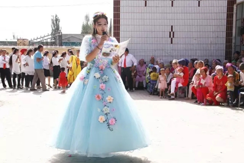 当身穿蓝色礼服的吐尔逊古丽缓步出场时,整个村委会大院瞬间被她点亮了。盛装下的她宛如花丛中美丽的“花仙子”,在众人的惊叹声中,她带着迷人的微笑,从容自信地主持文艺汇演。